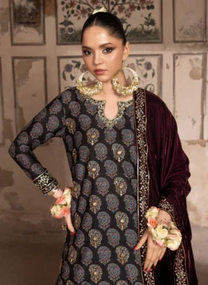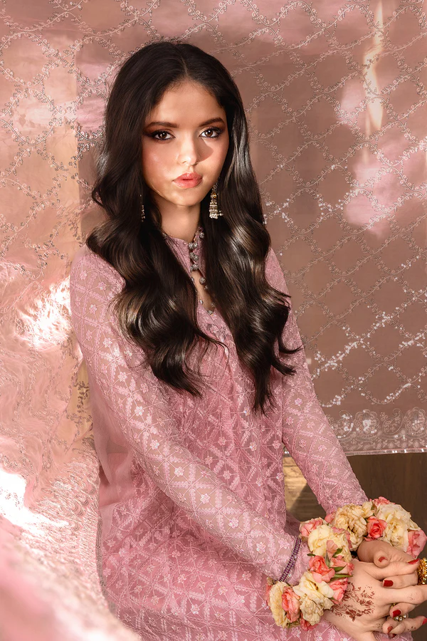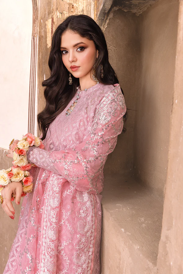 This elegant kalidaar peshwas showcases a soft powder pink color palette, creating a graceful appeal. The kaalidar features intricate tone-on-tone thread embroidery in geometric and floral patterns, highlighted with sequins for a refined shimmer. Neck is adorned with sawroski balls. Paired with sharara finished thru heavy sequin embroidered border and a heavily sequins embroidered organza dupatta with dense jaal in middle and detailed borders on sides.